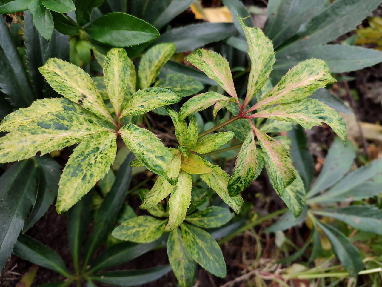 Ciemiernik cuchnący ma mocno powcinane liście i zielonkawe kwiaty, lubi cień i wilgotne podłoże. Ten ma dodatkowo białe przebarwienia na liściach.
