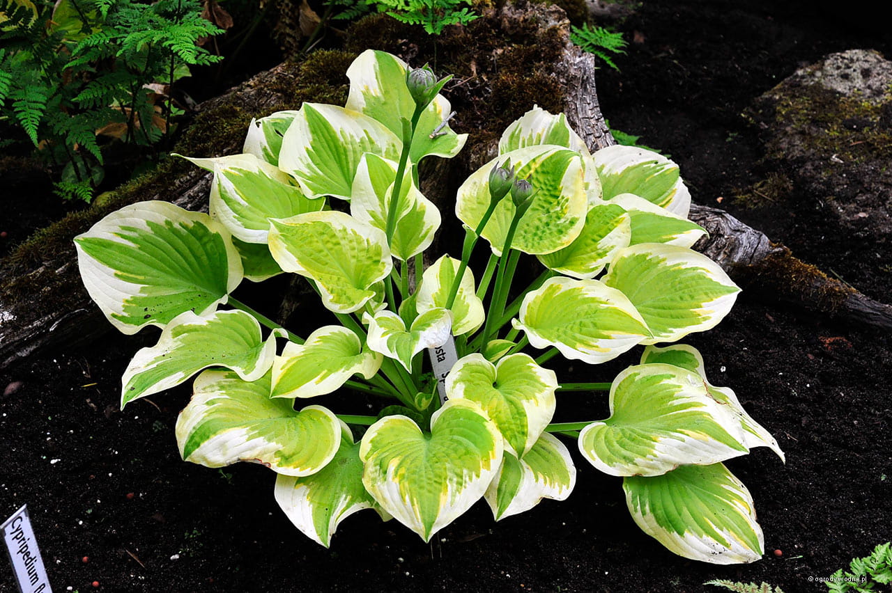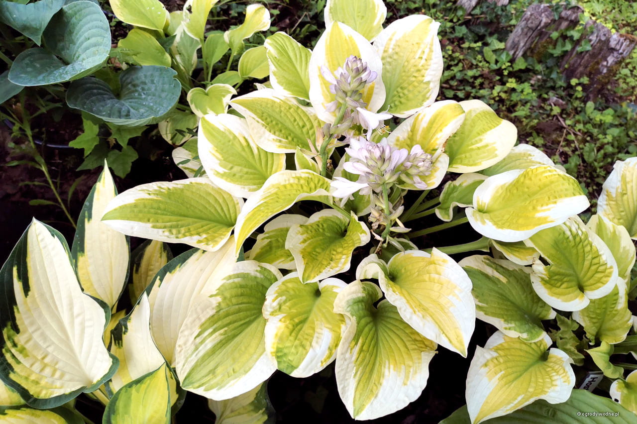 Na początku sezonu jasnozielony środek okolony żółtawym brzegiem, z czasem środek staje się w zasadzie żółty a brzeg biały - rzadko spotykana kombinacja. Przez jakiś czas jedną kępę tworzą liście zielone z żółtym i żółte z białym brzegiem. Kwiaty białe, pachnące.