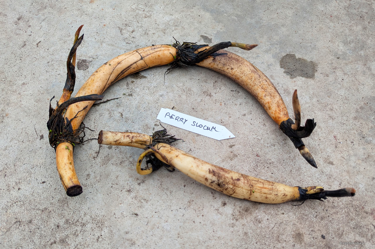 Odmiana „Mrs. Perry D. Slocum” ma kwiaty podwójne, zmienne - w ciągu kilku dni kwitnienia przebarwiają się od różu do morelowego. Odmiana bardzo duża, wymaga dużego pojemnika.
