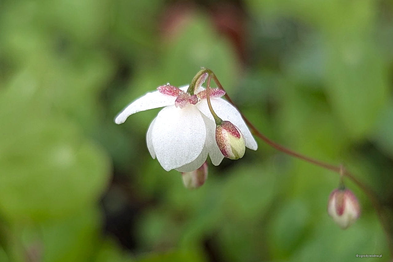 Niewielka odmiana epimedium o drobnych, czysto białych kwiatach. Liście żywozielone, dość drobne, tworzące gęste i zwarte kępy. Dobrze znosi okresowe susze. Gubi liście na zimę.